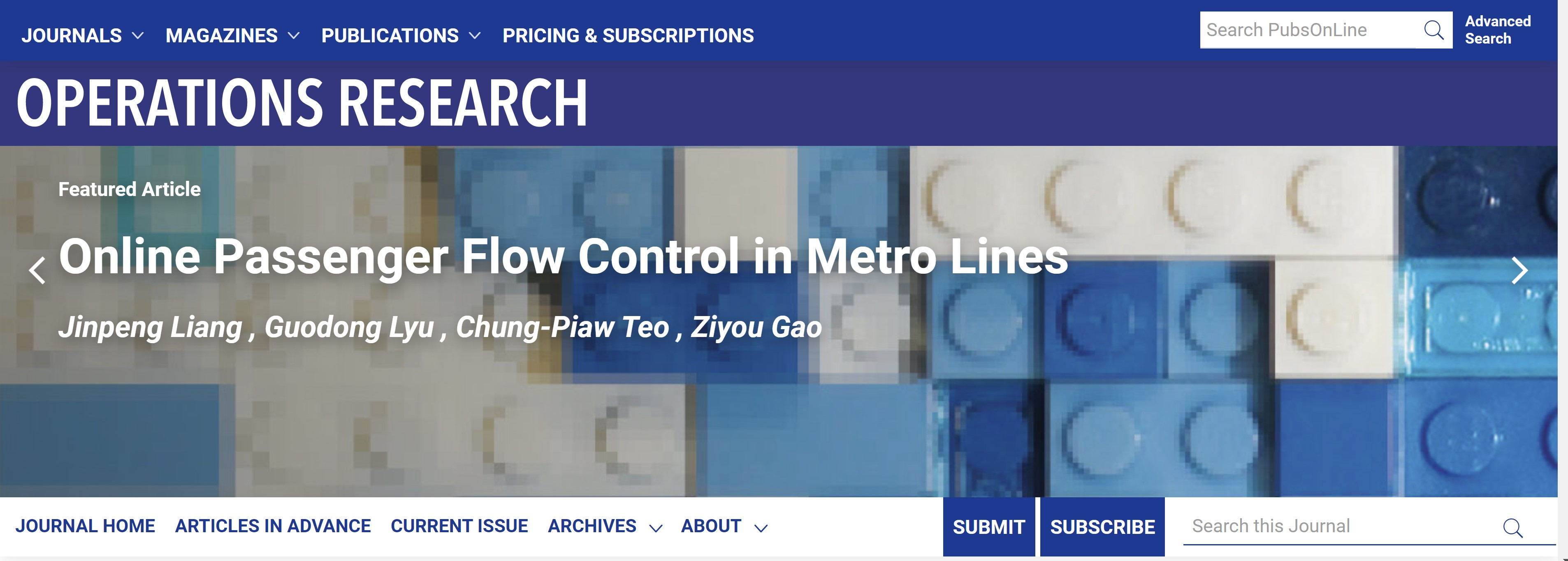 在国家自然科学基金基础科学中心项目和青年基金项目(批准号:72288101,72101042)资助下,红杏直播 红杏直播 高自友教授团队与新加坡国立大学张俊标教授团队合作,针对大城市轨道交通的高峰时段客流控制问题开展研究,设计了基于实时需求信息的客流控制策略。该成果以“城市轨道交通在线客流控制(Online Passenger Flow Control in Metro Lines)”为题,于2023年发表在《运筹学》(Operations Research)上,论文链接: //doi.org/10.1287/opre.2022.2417,并被选为当期的两篇亮点论文(Featured Article)之一(如图1所示)。